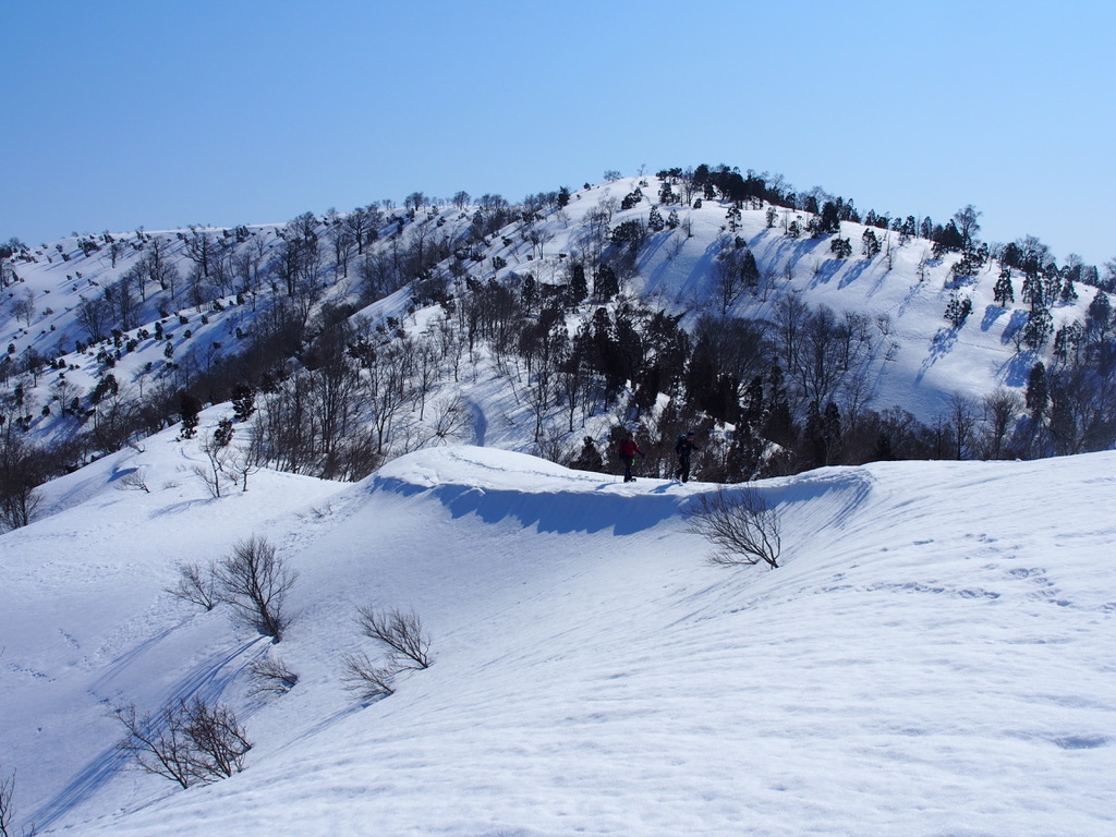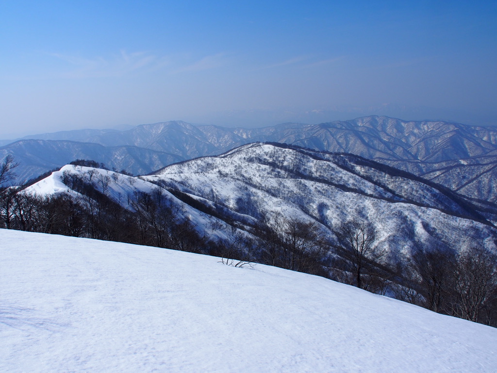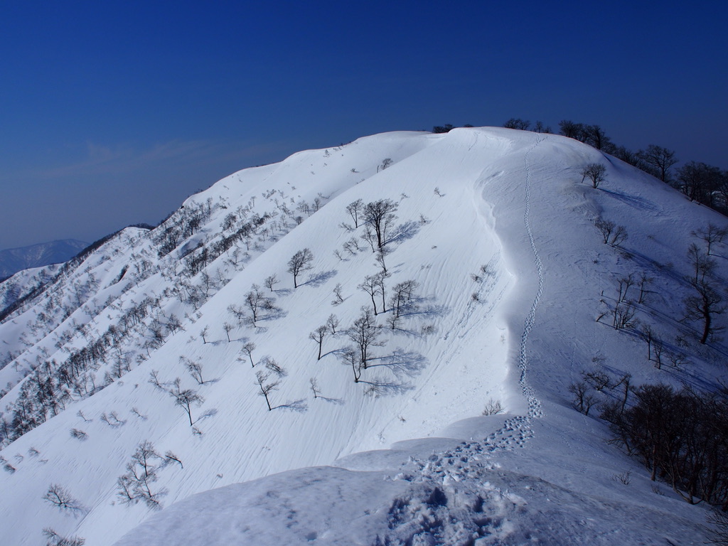 どこまでも緩やかに波打つように続く雪原はこの山の奥深さとは対照的に極めて長閑だ。尾根の右手には滝ヶ谷の右岸と左岸をなす二本の尾根が長く緩やかな下降線を描いている。