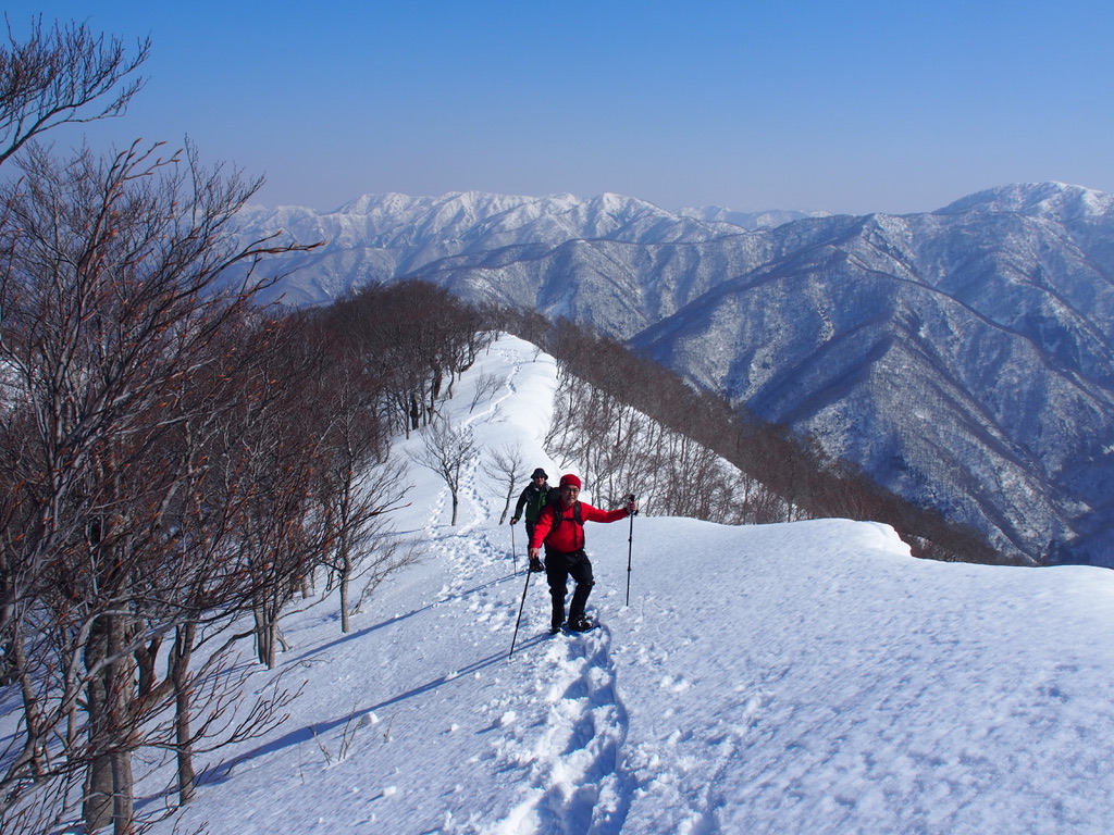 Keikokuさんとお仲間の三人が先を歩かれておられるので、雪稜には一筋のトレースが刻まれてはいるが、左右に近江、越前の壮大なパノラマを眺めながらの稜線歩きの爽快さを存分に味わうことが出来る。雲ひとつない蒼穹を背景に緩やかに純白の雪稜を無心に登る。
