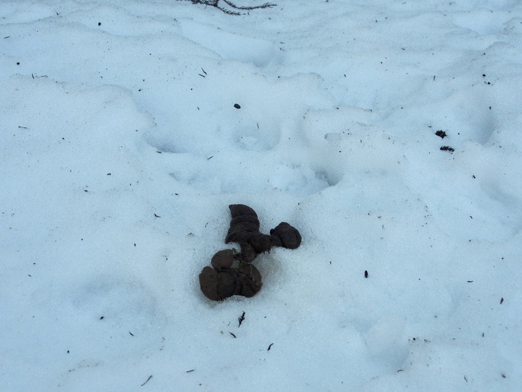 最後はお寺の境内の裏手に着地する。境内から除雪された道路に出ようとすると、真新しい大きな糞とそのそばには先ほど尾根の上で見たものと同じ爪跡のある足跡があるのだった。