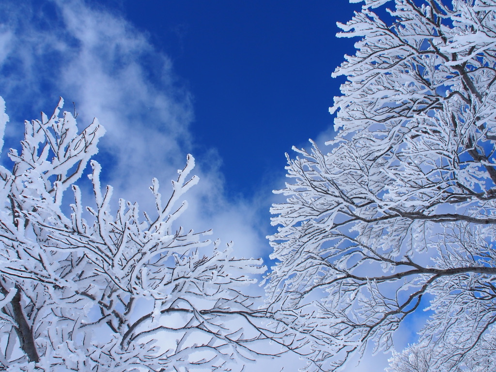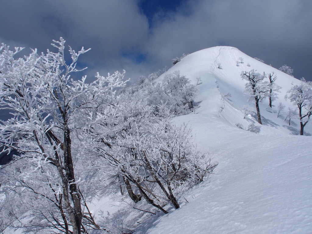 あまりにも霧氷の景色が素晴らしいので、この左千方への登りはなかなか先へに進めない。上空の雲の流れは早いが、幸い、風はそれほどきつくない。左千方への最後の登りに差し掛かるとその真っ白な頂きの先にはようやく蒼穹が広がり始める。わずかに1kmほどの距離に30分以上の時間をかけて左千方の山頂へとたどり着いた。