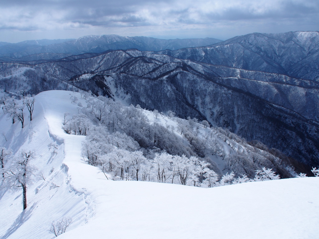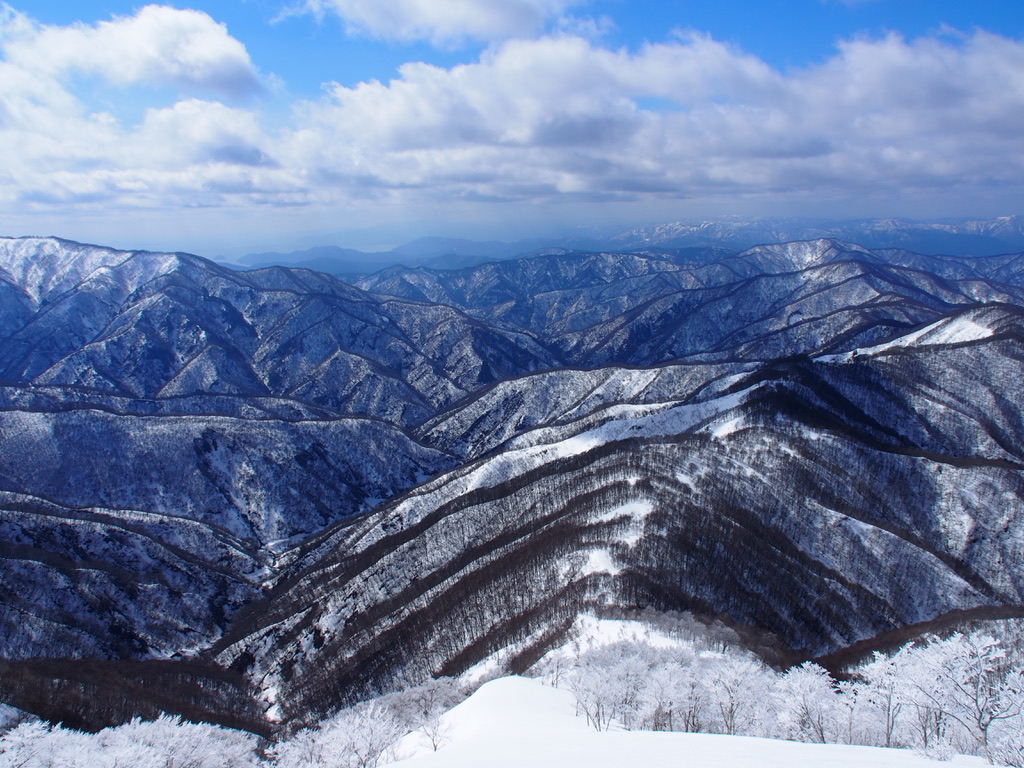 まずは三国岳への霧氷の尾根を往復することにする。左手に上谷山、右手には高丸から三周ヶ岳、白銀に輝く霧氷の稜線を眺めながら大きく雪庇の発達した広々とした吊尾根を進む。これらの山々も山頂の周囲はやはり三国岳が近づくと霧氷の厚さは一層、スケールアップしているようだ。三国岳の山頂では行動食を頬張りながら、上空を足早に通り過ぎてゆく雲烟を仰いでは、雲の切れから溢れる光が霧氷を煌めくのを愉しむ。