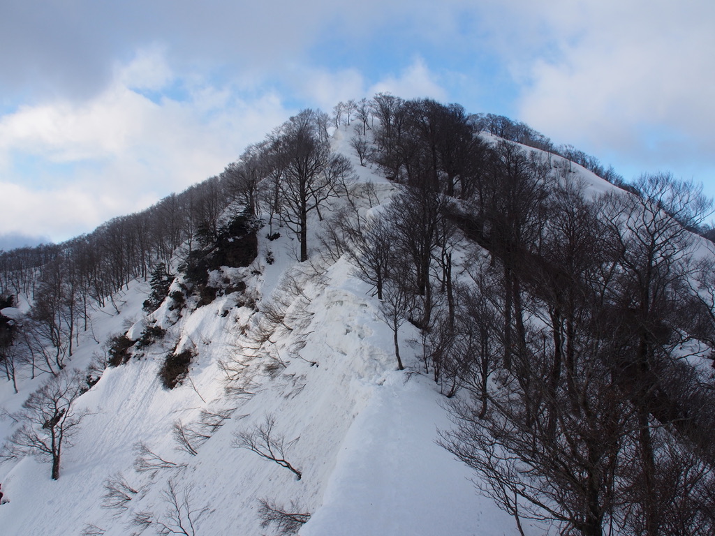 やがて尾根上には登る者を威圧するような巨大な雪庇が現れる。前回、訪れた時は膝の骨折後、始めての山行ではあったが、ラッセル巧者の友人の夫妻の先導により何とか通過することが出来たがこの日は雪庇はガチガチに固まっており、正面突破は到底無理だ。雪庇の右側から回り込みよじ登る。結果的には何とか通過出来たものの、安全を考えるならば左側の藪の斜面から登るべきであったと反省する。