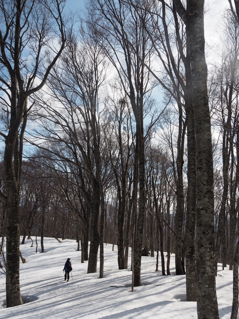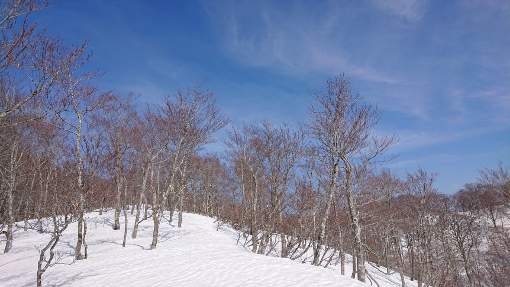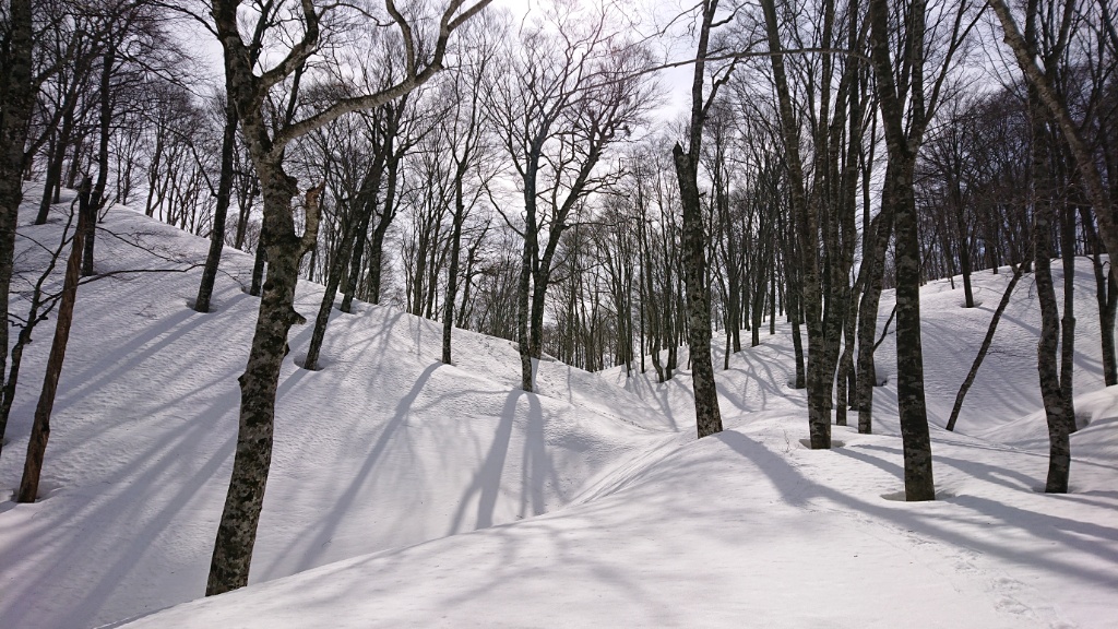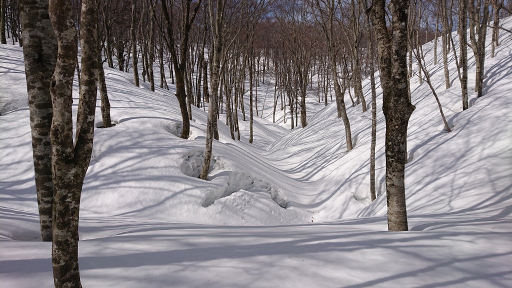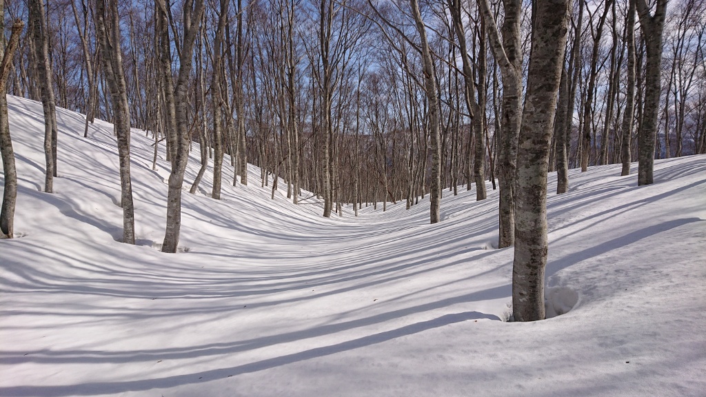 谷はブナだけではなくミズナラの大木もあったような記憶が。その先の鞍部の小さな落ち込みが描くカーブも素敵です。