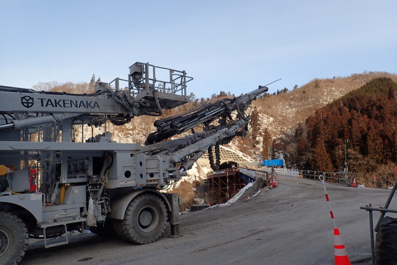 >九頭竜川沿いでは中部縦貫道の工事が急ピッチで進められており、この林道入口も工事現場となっている。山腹に
