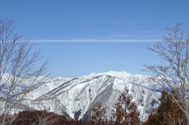 >右手に見える谷間に大きく開けた街並みはどこだろう。見慣れない場所からの展望は、位置関係が即座に判断できず、とまどってしまう。高速道路らしき道が走っているところを見れば、高鷲から蛭ヶ野あたりだろう。奥の斜面のスキーは鷲ヶ岳か。考えてみれば、背後はるか遠くに見える越美国境稜線が、今いる場所の先に繋がっているというのだから面白い。