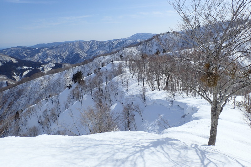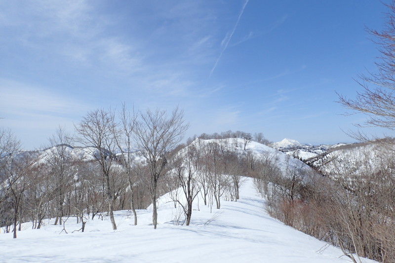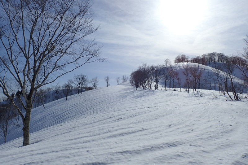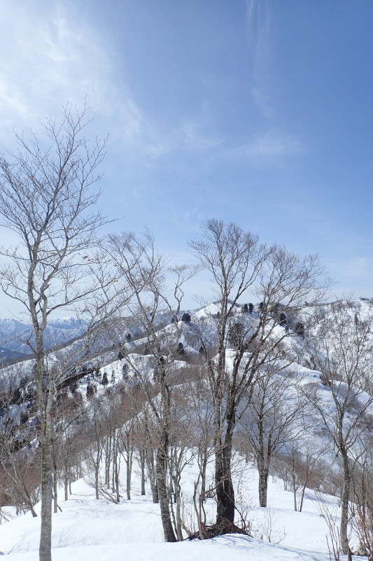 あまりの去り難い風景に2時間ものんびりしてしまった。もちろん、後の行程から逆算しての時間配分だが。岩ヶ谷山へも同じような雪尾根が続くが、少しブナが増えてきたようだ。尾根の南側には雪庇が張り出している。