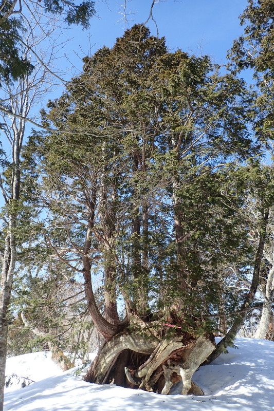 ところどころに巨大なヒノキの奇木が見られるのもこの山域の特徴だ。木の真ん中をくぐれる根上がりのヒノキも