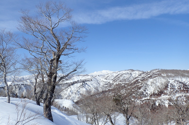 三ノ宿の山頂はブナの疎林の大雪原になっていた。石徹白の山々と別山、白山から北アルプス、乗鞍、御嶽、中央