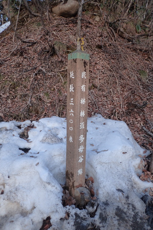 漢字は違うけど、共通するのは、「タモ」でしょうか? なんかの意味が込められてるんでしょうね。三角点名は「保谷奥」という。この山に向かって伸びる谷は、地図では田茂谷と表記されているが、林道の標識は多母谷となっており、保谷と合わせて3つの名前がある。どれが本当なのだろう。
