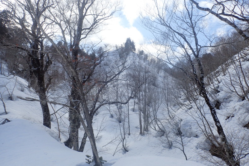 やがて谷は広い二俣状になったが、どちらもすぐに行き止まりのようだ。地形図では浅い谷地形が山頂直下の