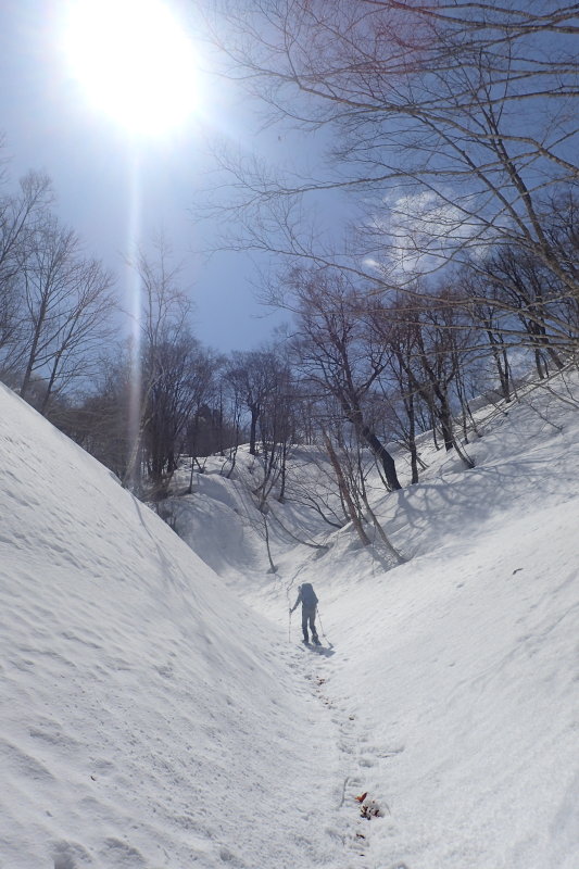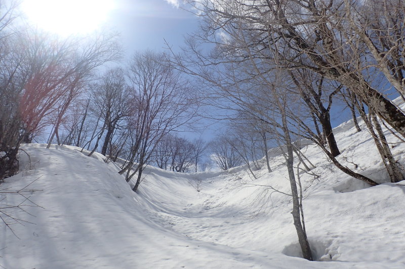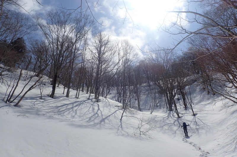 雪が安定していそうなので、まるで迷路のような雪の谷間に飛び込み、右の谷を選択した。展望とは無縁だが、