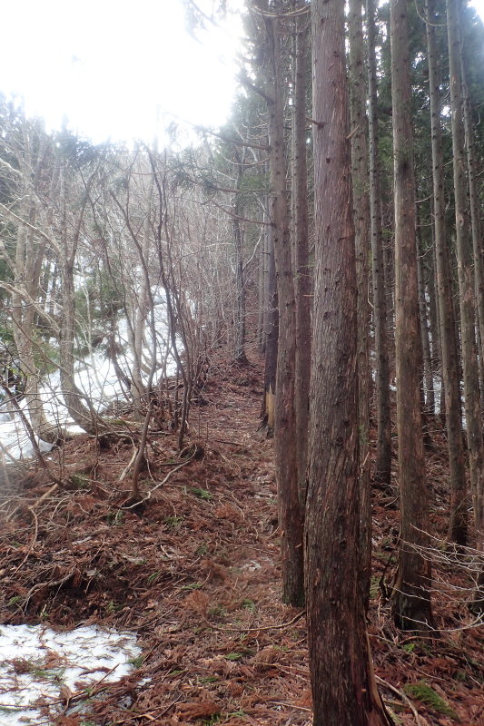 思っていた植林がいつまでも終わらない。尾根芯は杣道が露出しているので、途中からスノーシューを脱ぐ始末。
