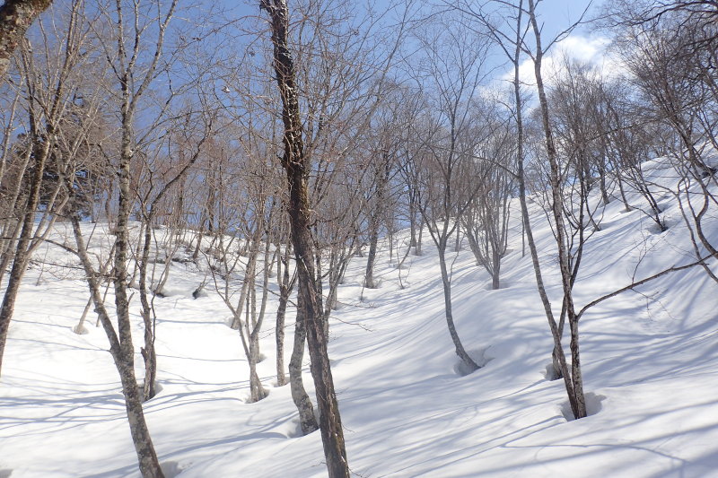 右から回り込んで正面の雪壁の上に乗ると、美しいブナ林の台地となった。山頂はもう目の前だ。