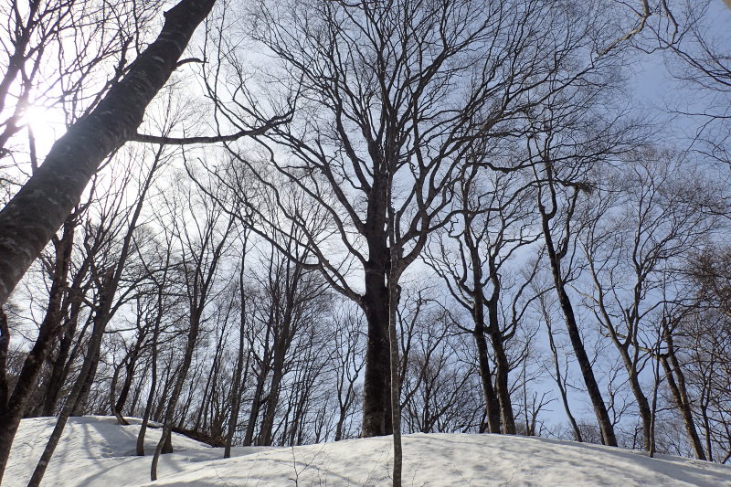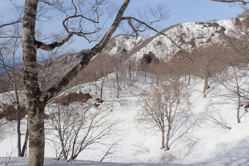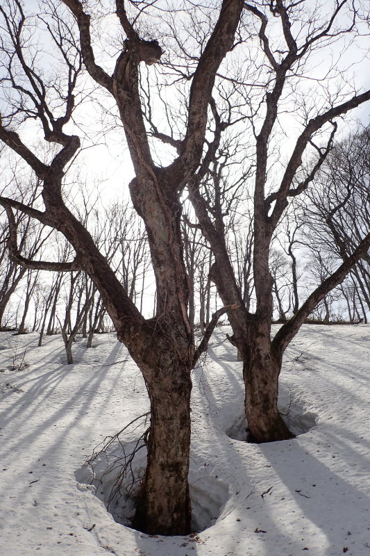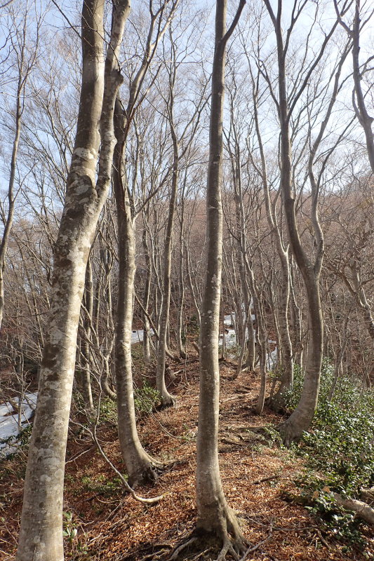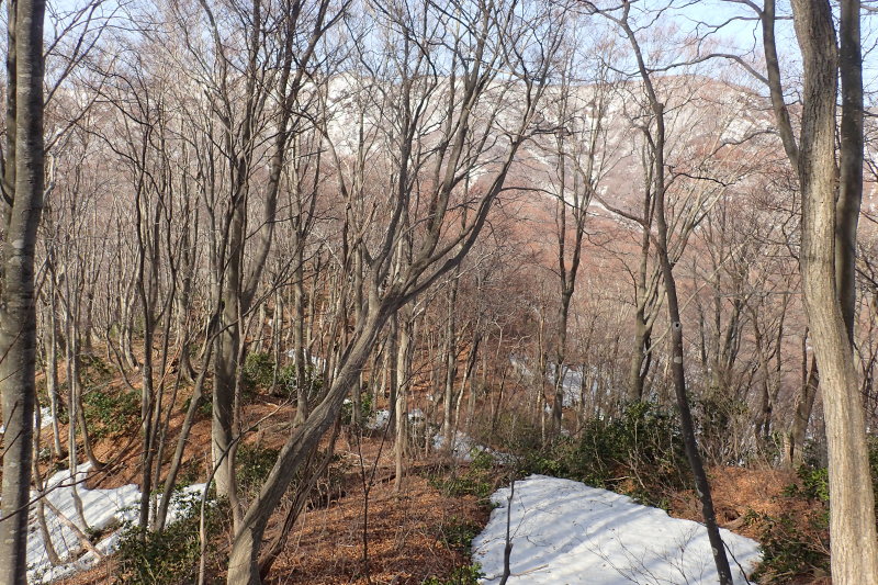 上部はブナ林を楽しみながらの広い雪尾根歩きだが、雪の消えた下部ではアイゼンを脱ぐと滑って苦労する。