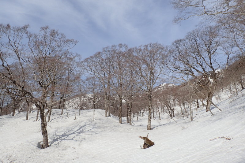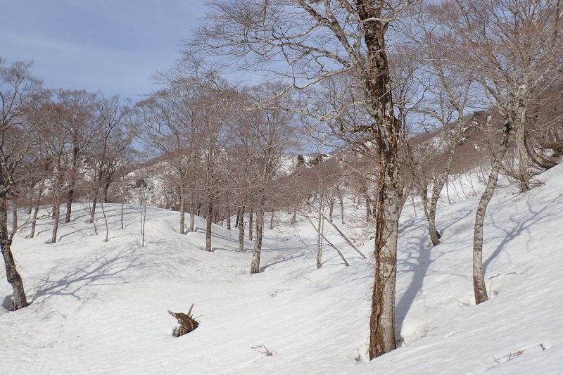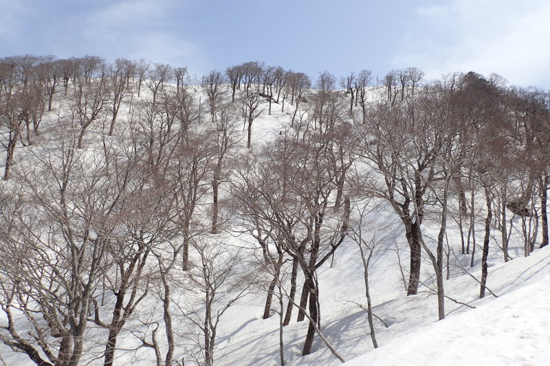 岩谷林道終点からの尾根を合わせる手前の北側斜面が素晴らしい。広く緩やかな谷状の雪原に、トチの大木が点