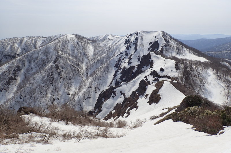 越美国境稜線と三周ヶ岳とのジャンクションピークから見上げる雪の三周ヶ岳は、