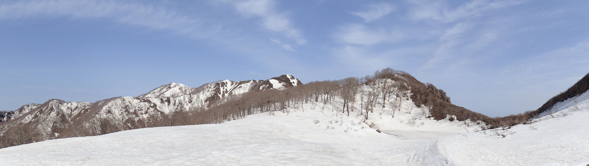 立ち木もほとんどない台地はすり鉢状で、すり鉢の縁にはブナ林が広がっている。その縁の向こうには一段下がっ
