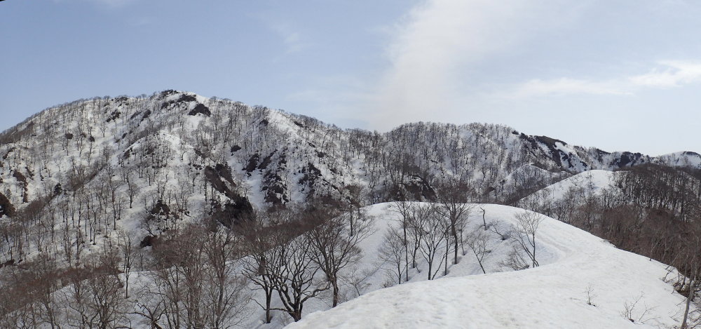 ここから見る三周の山頂への雪稜は迫力がある。右の根洞谷側斜面は崩れた雪庇の断面が荒々しい姿を見せる。