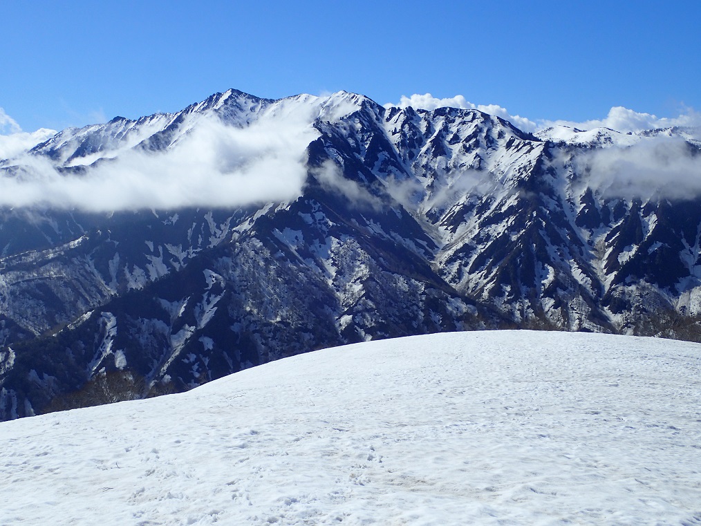 銀山平は標高800mもないのに、いきなりの豪雪である。やっぱり新潟県は違う。トレースは消えている。道行山へは、登山道の隣の尾根に取り付いたが、藪が出ていて、引き返した。道行新道の雪はかなり溶けて、イワウチワやカタクリが咲き始めていた。