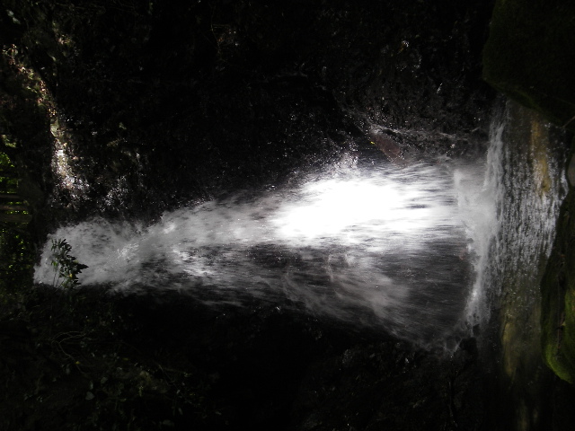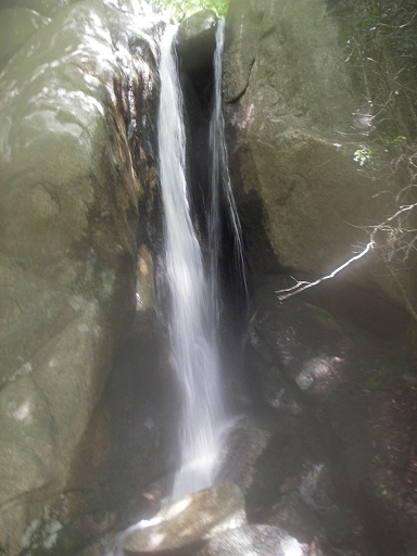 。左端に取り付いてみるが、いい手掛かりがない。その右側で手掛かりを探すが細かくて微妙な手掛かりしかないので、あれこれやっているうちにしっかりシャワーを浴びてずぶ濡れだ。微妙な手掛かりを頼りに何とか取り付いたら後は左端の方を慎重に登って落口に出た。落口の上に出たら達成感で「よっしゃ!」と小さくガッツポーズ。