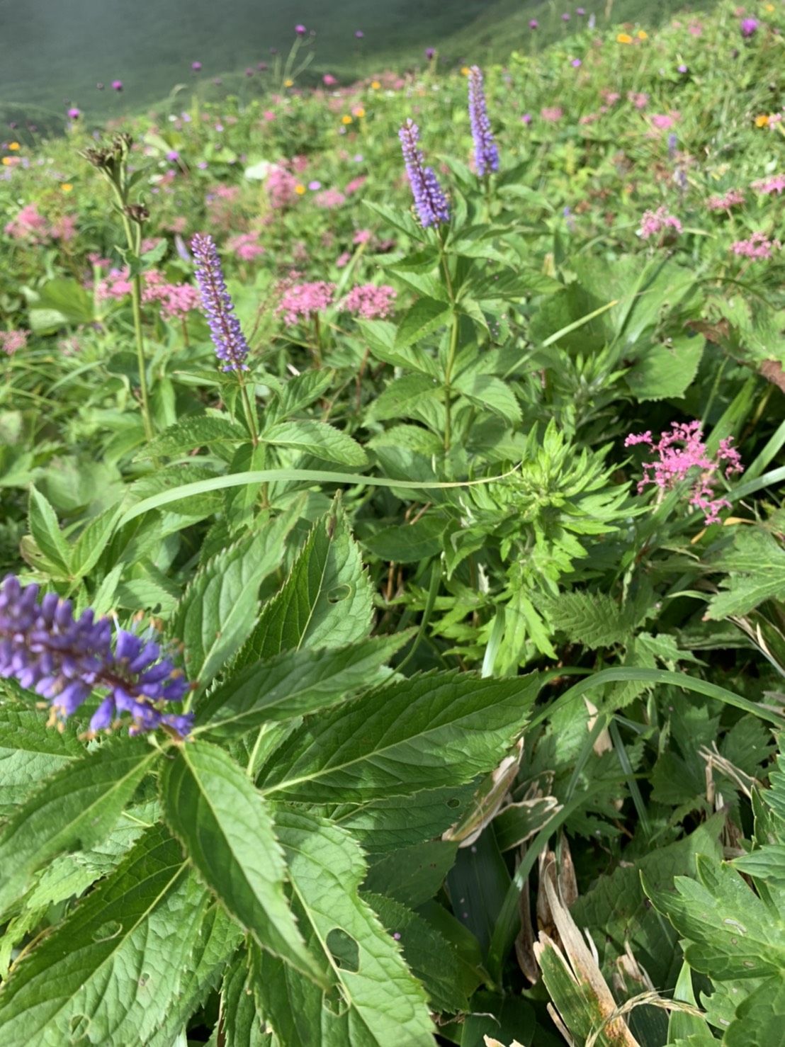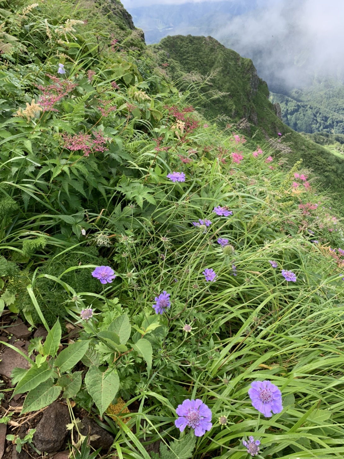 高度を上げると開けた登山道に シモツケ草 ウツボ草 マツムシソウ カワラナデシコ  ハクサンフウロ シオノオトギリソウ