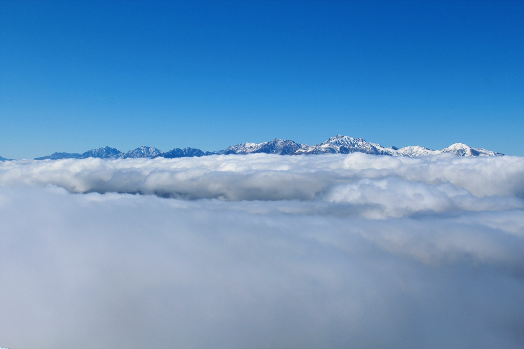 西には、遠く、雲海の上に北アルプスの山並み。