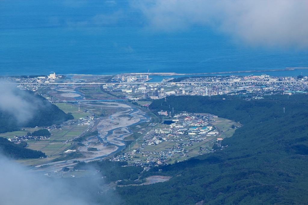 北には、雲海の間に日本海沿いの街が見える。