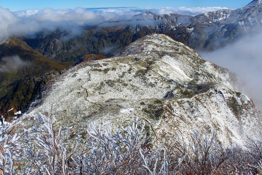 急登を登りきると、なだらかな笹原がひろがった。積雪している。