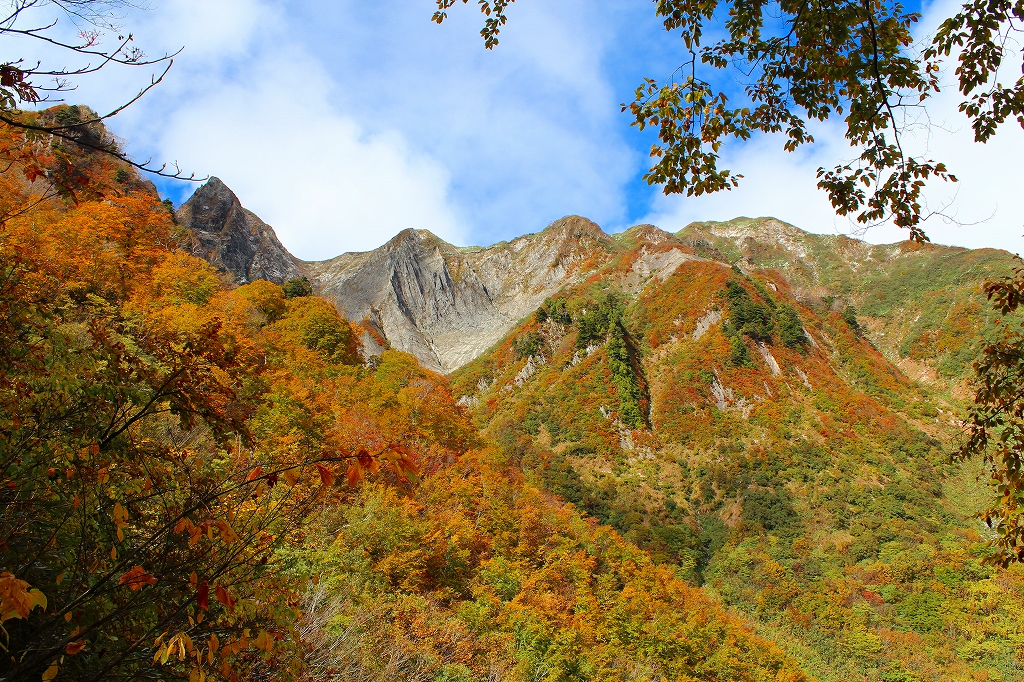 荒菅沢では、朝、雪化粧していた山並みが、すっかり雪が溶けて、黄葉の山並みになっていた。