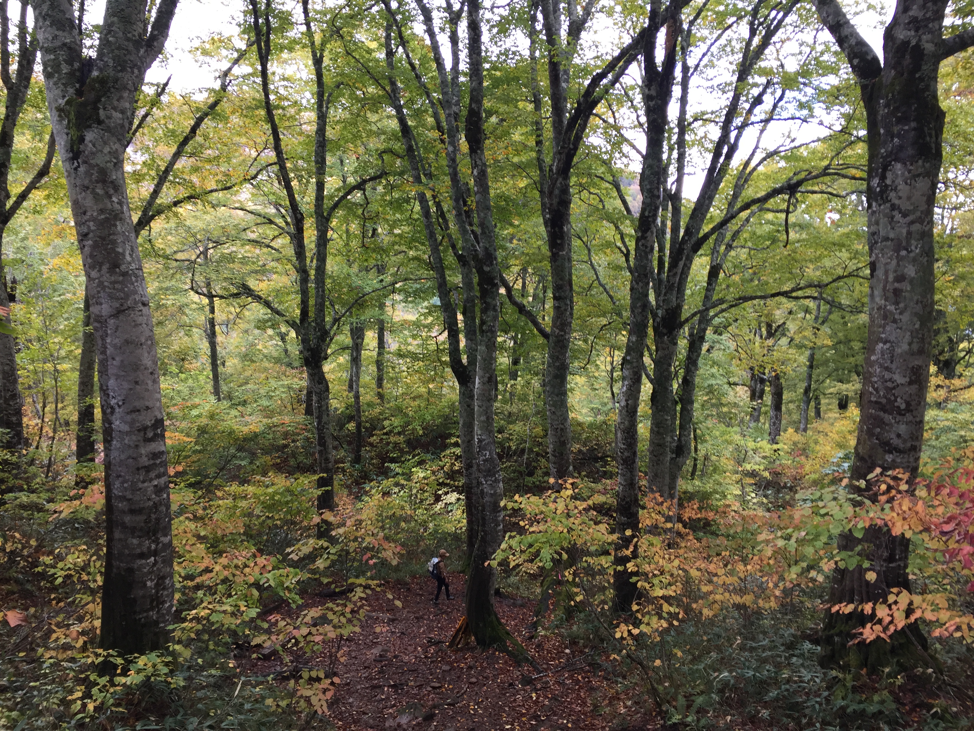周りの木は、黄色くなっている葉が多い。地点名のブナ平の名のとおり、背の高いブナの木もたくさんあった。