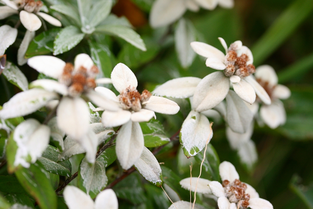 登山道途中から、葉の上に雪が載っている。