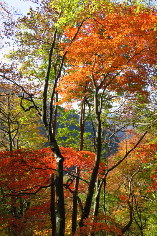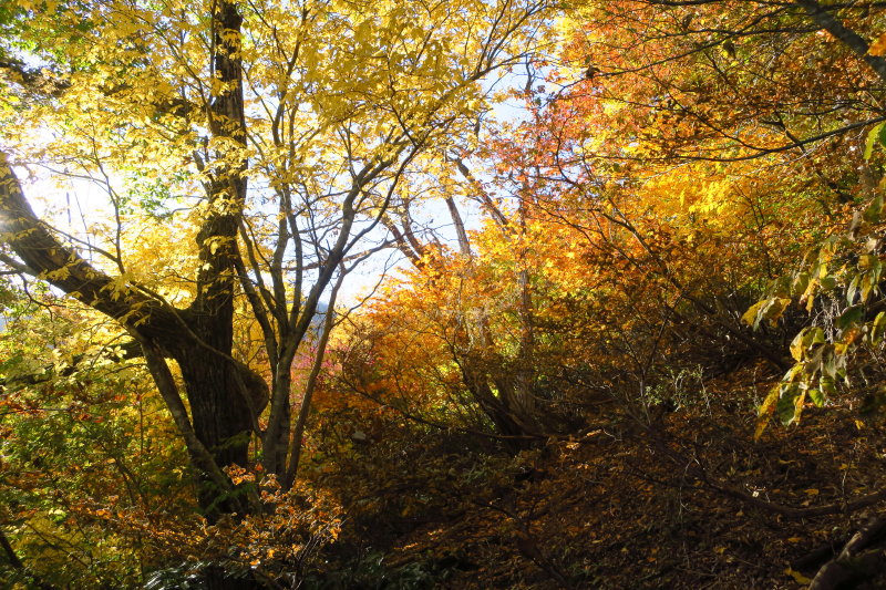 思いのほか快適な尾根に快哉を叫びながら歩く。ところどころに真っ赤やオレンジ、まだ緑のままの三段染め