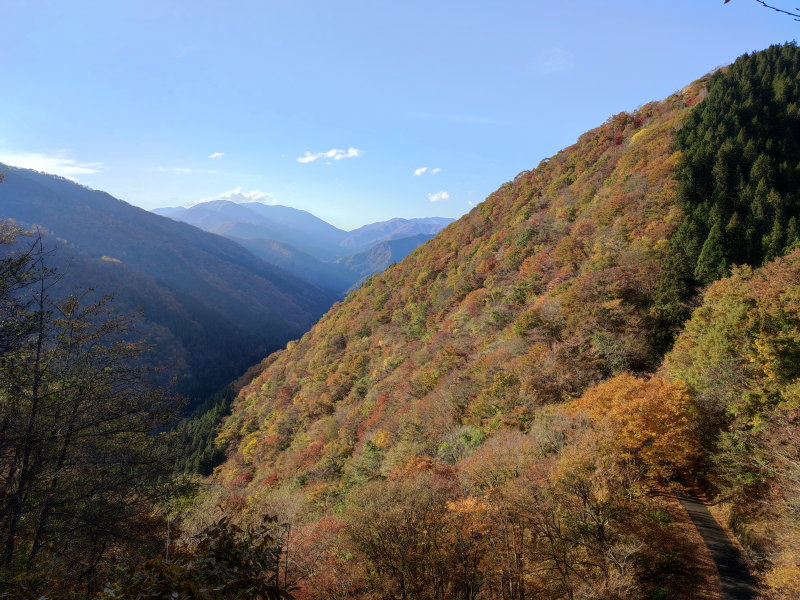 峠からは長い車道歩きが待っている。最初のうちは紅葉のワインディングロードや名所の大トチなど見どころ