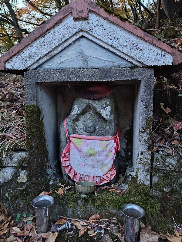 越波からの帰路、折越峠のお地蔵さんにご挨拶して行く。目を細めて柔和な顔で微笑む表情が優しく、かつて