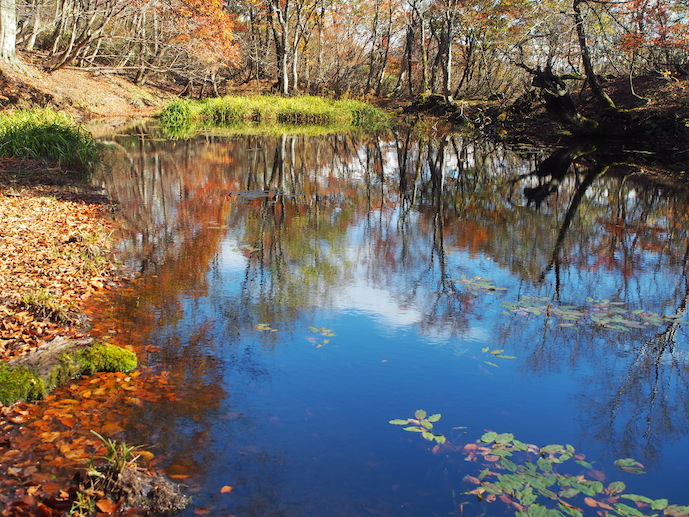 >やがて武周ヶ池に至ると池のほとりでは紅葉したカエデが一帯を真紅に染めている。池の水面から生える水草の緑色がこの時期にはひときわ瑞々しく感じられる。