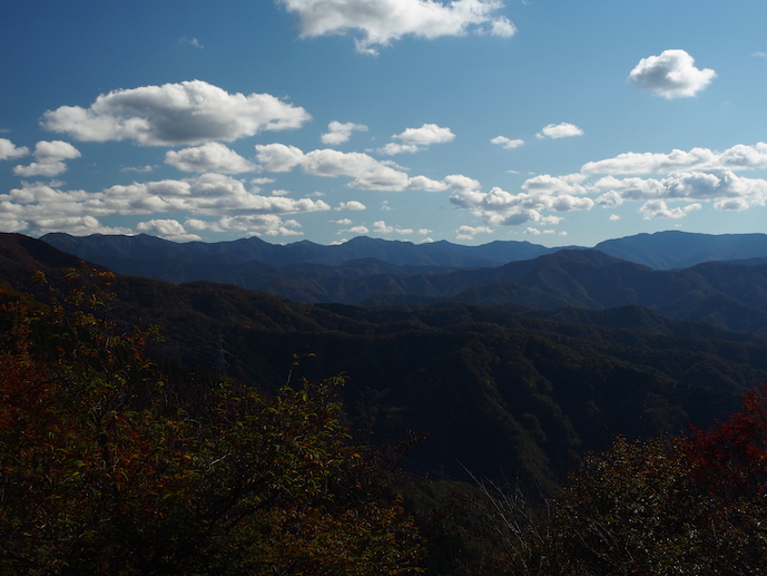 池を後に出発すると、すぐに送電線鉄塔のある野見ヶ岳に達する。山頂には送電線鉄塔があるが、周囲は灌木の藪が広がっており展望は得られない。野見ヶ岳から先は歩く人が少ないのだろう。急に道は細くなり、ところどころで踏み跡も薄い。既に落葉した樹々のせいで、秋の透明な陽射しがふんだんに差し込む尾根は明るいが、葉が生い茂る季節は鬱蒼とした雰囲気が予想される。