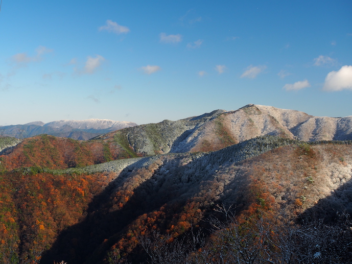尾根が細くなると尾根上には明瞭な踏み跡が続くようになる。送電線鉄塔からは大きく近江平野の展望が広がる。北側のカクレグラは冠雪した山頂部と山裾の紅葉とが綺麗なコントラストを見せてくれる。