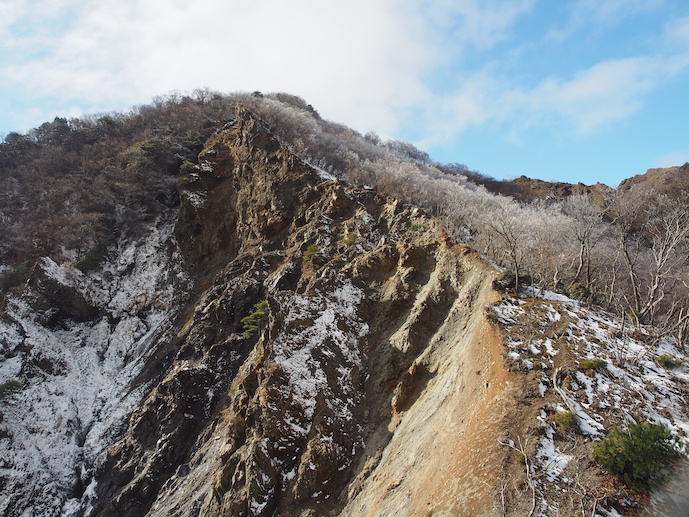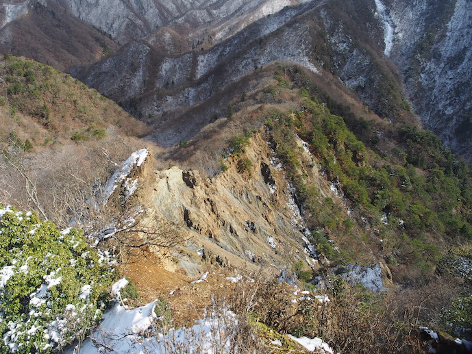 道は左手の低木の斜面をトラバースしながら下降することになるのだが、これが当然ながらかなり急斜面だ。斜面に薄く雪が積もっているところは慎重を要する。雪が多少積もっている方が明らかに歩きやすい。なんとか急斜面を無事に下降してガレ場を振り返ると、改めてガレ場の険阻な様相に驚くのだった。