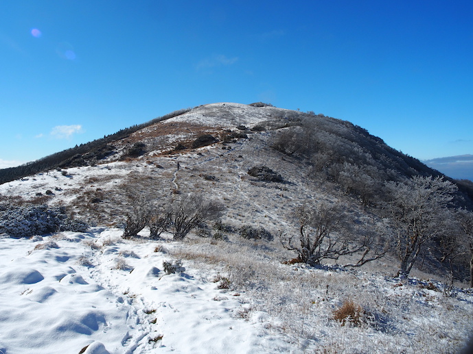 霧氷の樹林を抜けて清水頭に至ると樹木のない苔の裸地が広がる。