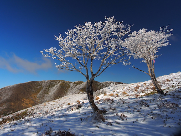 つい一月ほど前、オフ会の帰路にSHIGEKIとご一緒に歩いた時には杉峠のあたりでは紅葉が見事だったが、今や樹々には紅葉の名残りもみられない。峠から千種街道を下降し始めるとすぐにも霧氷はみられなくなった。10数年前の11月の初めに大雪が降ったことがあります。紅葉の最盛期に新雪が積もってなんとも言えない風景でした。