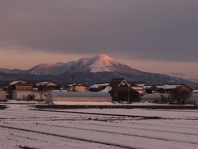 宇賀神社を回り込んで出発地の朝日山神社に向かうと道路の右手に見える伊吹山がローズ・ピンクに染まっているのだった。