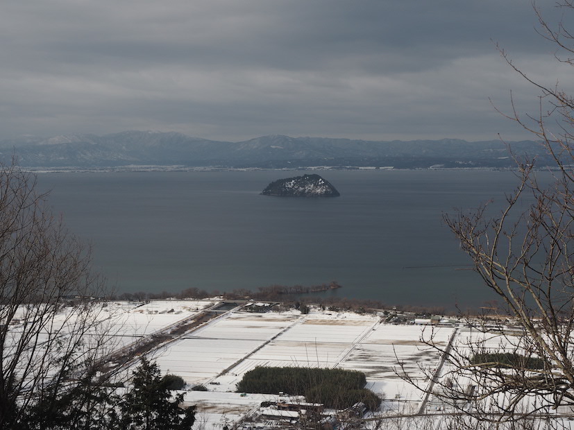 集落に降りるといよいよここからが湖辺歩きだ。残念ながら湖辺には雪は少ない。この日の琵琶湖の水位はマイナス10cm。前回、歩いた11月の下旬に比べると相当に水位が高くなっている。そう簡単には水位は回復しないものだろうと思っていたが、急に水位が回復した原因は年末年始の滋賀県における記録的な大雪のために他ならない。