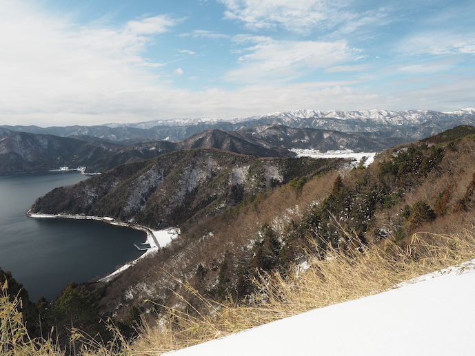 神社の下は現在の水位では通過が困難な可能性があるので、神社の手前から伸びる細い踏み跡を辿って山中をトラバースする。まもなくしっかりした道が現れ、再び湖岸に降ることが出来る。岸辺には二人の釣り人が糸を垂れていた。西野水道から歩いて来られたらしい。