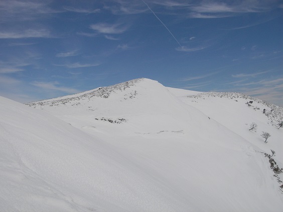 山頂台地の南端付近が見えてきました。あそこまで登れば後は天国です。正午頃に南端のすぐ下にたどり着いたのでそこでランチにしました。殆ど休みなく登ってきたので息は切れ切れ足はガクガクです。これでスキー滑降などできるのでしょうか。