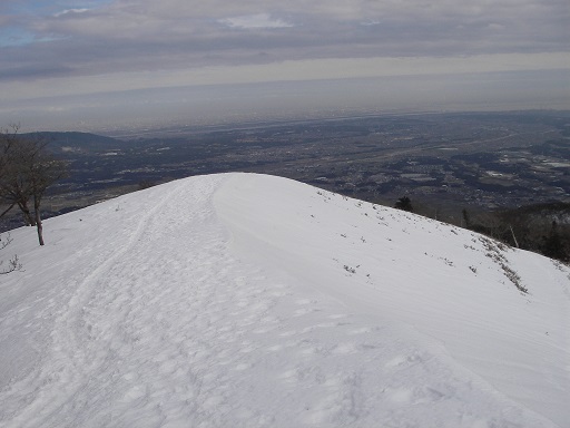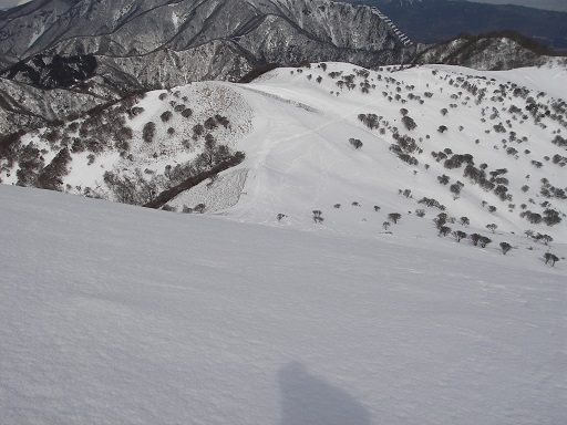 遠足尾根が曲がるところからスキーで滑れる緩やかな斜面だが、ルートの両側ともスノーシューやワカンで踏み荒らされているのがちょっと残念。スノーシューの皆さんもバージンスノーを踏みつけるのが楽しいようだ。まあ、みんな考えることは同じでしょう。