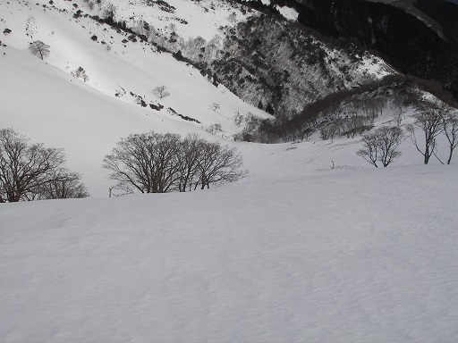 ホタガ谷の源頭はスキー場のゲレンデみたいでどこでも滑れて気持ちがいいのですが、登り返す体力が残ってないので諦めました。