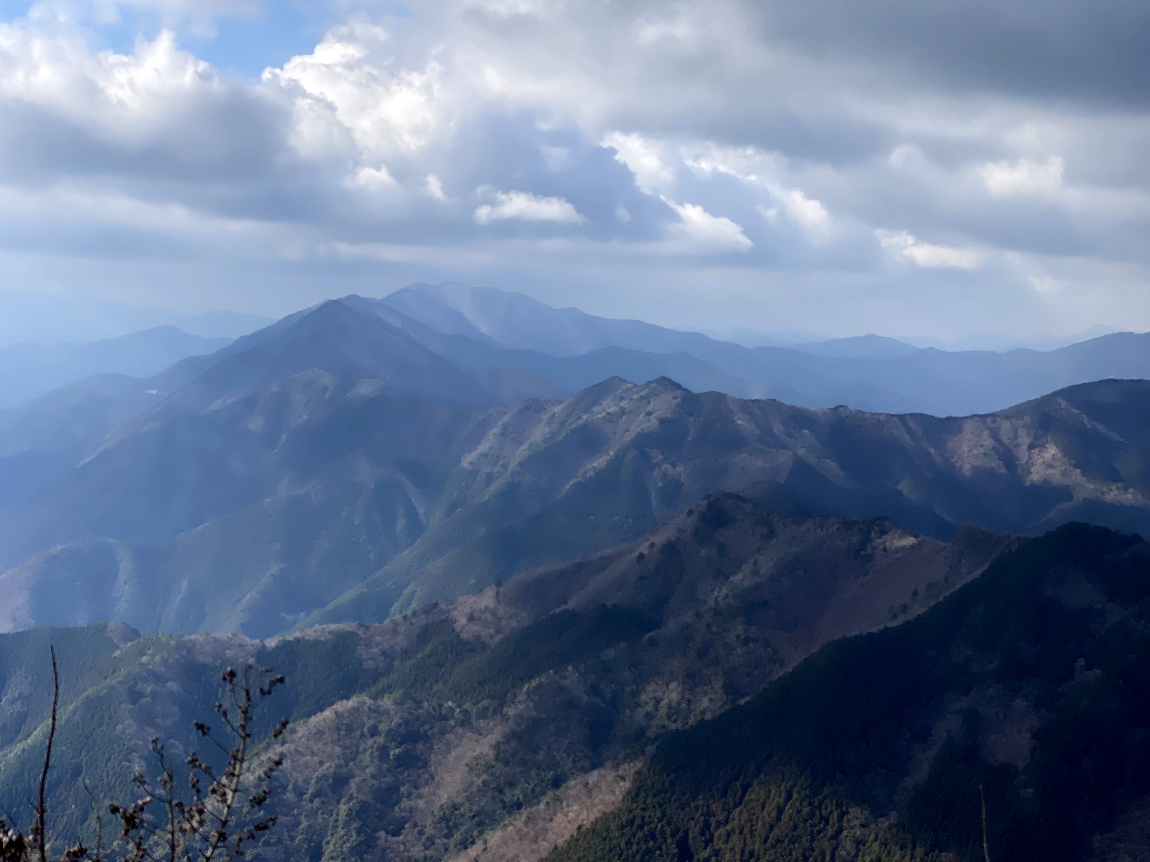 局ヶ岳山頂は遮るものがなく、360度のパノラマが広がっています。三峰山までの縦走路が見えるので