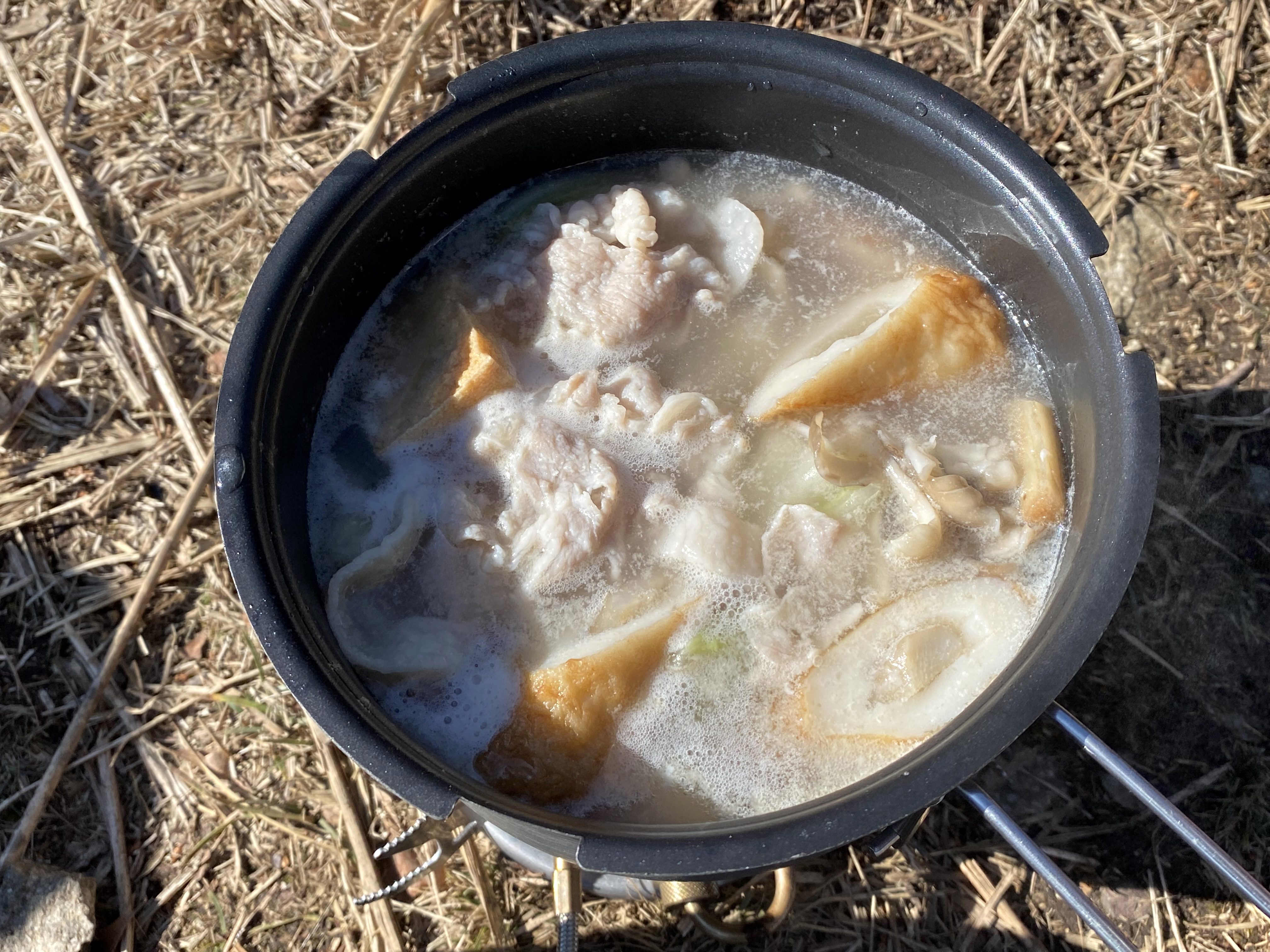 樹木が風を遮ってくれて、豚しゃぶ鍋を堪能することができた。