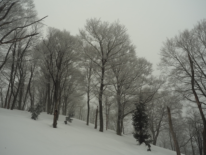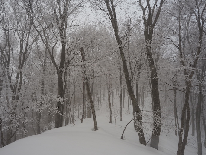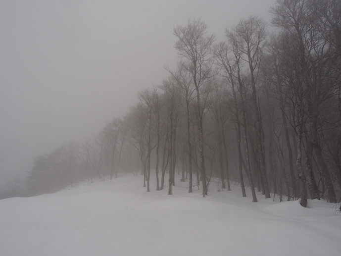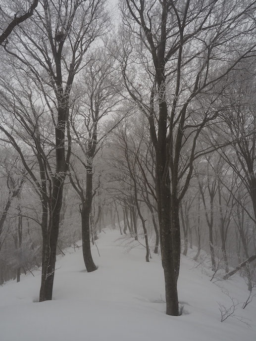二重山稜の織り成す襞の間を進むと小さなコルの先ではなだらかな雪原にブナの大樹がままばらに生える美しい光景が広がっていた。雲の中から淡い光が零れ落ちてはブナの優美なシルエットが雲を背景に浮かび上がる。霧氷を纏って屹立するブナの間を光が通り過ぎてゆくのを小さな谷間から見上げたまま、なかなか動けない。