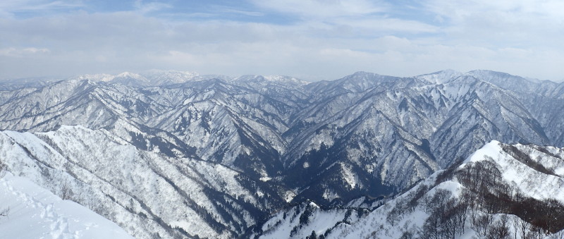 あたりはいつしか広葉樹の自然林になり、広々とした谷状の雪面をひと登りすれば見事な展望が開けた。